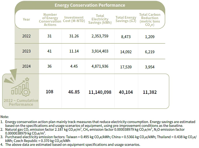 To enable all operational sites to use energy more efficiently, we explore a variety of energy conservation measures and are committed to building low-energy-consumption facilities. Through systematic replacement of high-energy-consuming equipment, we are dedicated to achieving the ultimate goal of energy-efficient operations. In 2024, specific measures included installing self-owned solar energy facilities, replacing natural gas boilers with air-source heat pump water heaters, adopting behavioral changes in the use of air conditioning and lighting, replacing motors with energy-efficient models, optimizing air compressor utilization, upgrading and improving the efficiency of chiller systems, replacing lighting in factories, warehouses, and outdoor areas with LED or solar streetlights, replacing air compressors with variable-frequency models, and implementing waste heat recovery systems. In 2024, these actions resulted in electricity savings of 4,871,936 kWh, energy savings equivalent to approximately 17,539 GJ, and an estimated reduction of about 3,954 metric tons CO2e.