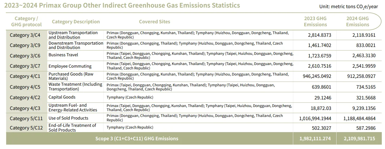 In addition to calculating greenhouse gas emissions from significant sources in accordance with ISO 14064-1:2018, Primax also measures various categories of indirect emissions following the GHG Protocol methodology. In 2023, Primax implemented a carbon management system to systematically collect and consolidate large volumes of Scope 3 data. This year's inventory scope was expanded to include Tymphany (Czech Republic), and additional categories not covered in 2022, such as employee commuting, capital goods, and end-of-life treatment of sold products. The year 2023 was established as the baseline year for Scope 3 emissions.