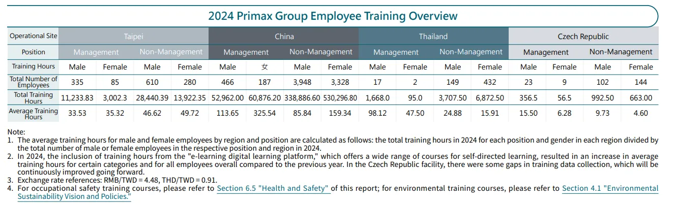 Primax Group places great importance on employee career development and provides all employees with the right to participate in training. In 2024, employees of Primax Group participated in courses organized by the Human Resources Department, excluding occupational safety and environmental training, accumulating a total of 1,054,032 training hours, with an average of 108 hours per employee and total training expenses amounting to NT$6,966,456.3.