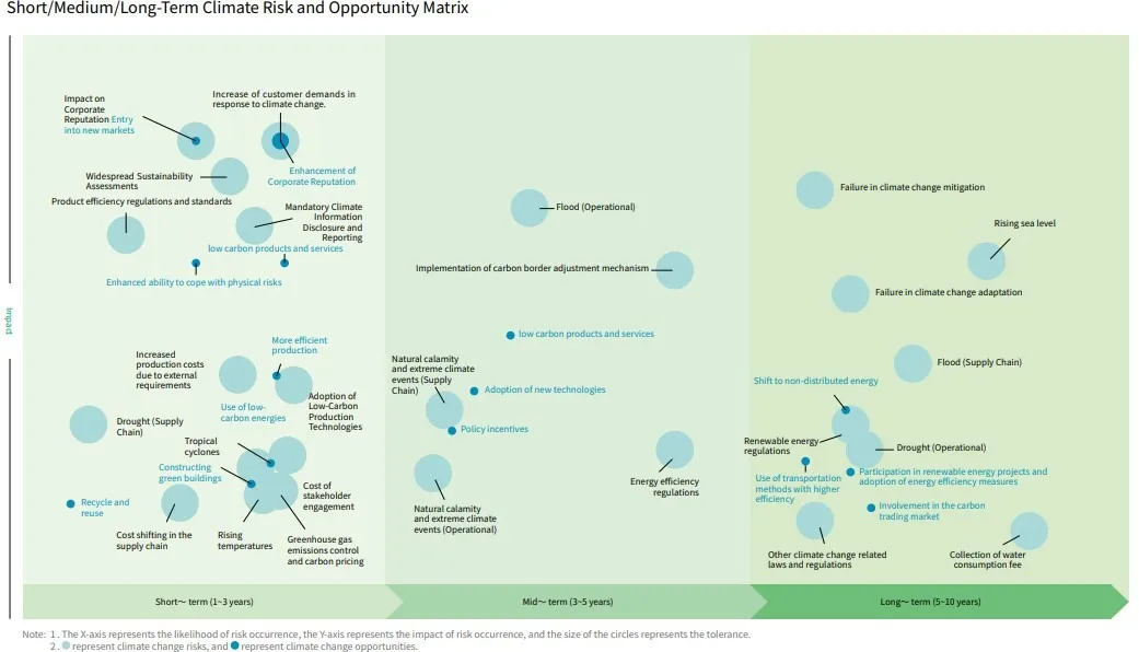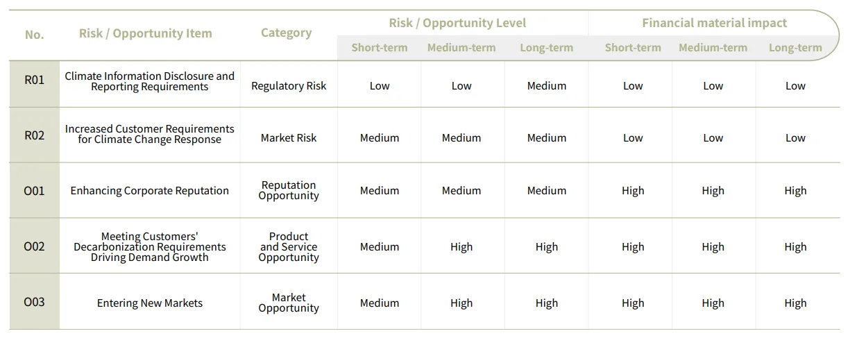 Based on the above analysis, and after discussion by the assessment team, taking into account the Company's actual circumstances and the potential challenges it may face in the future, the key climate risks and opportunities for the year were determined as presented in the table below. The ESG Office has conducted further discussions and revisions regarding response strategies and resource allocations in accordance with the assessment results. The ESG Office will continue to monitor changes in the results of the annual assessments and will regularly present both the assessment results and the decisions formulated.