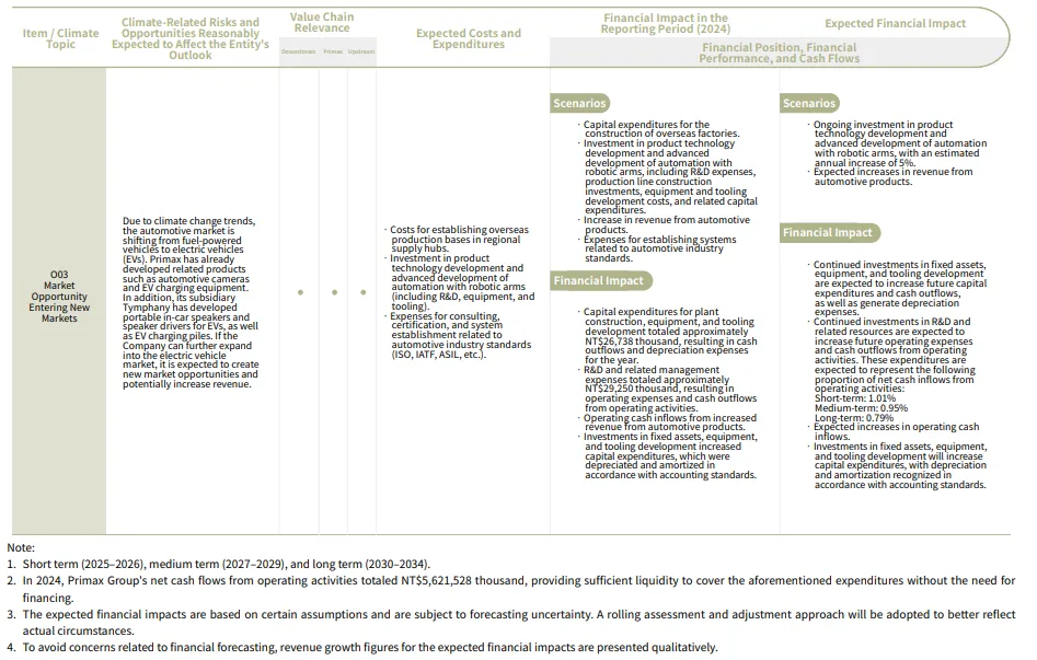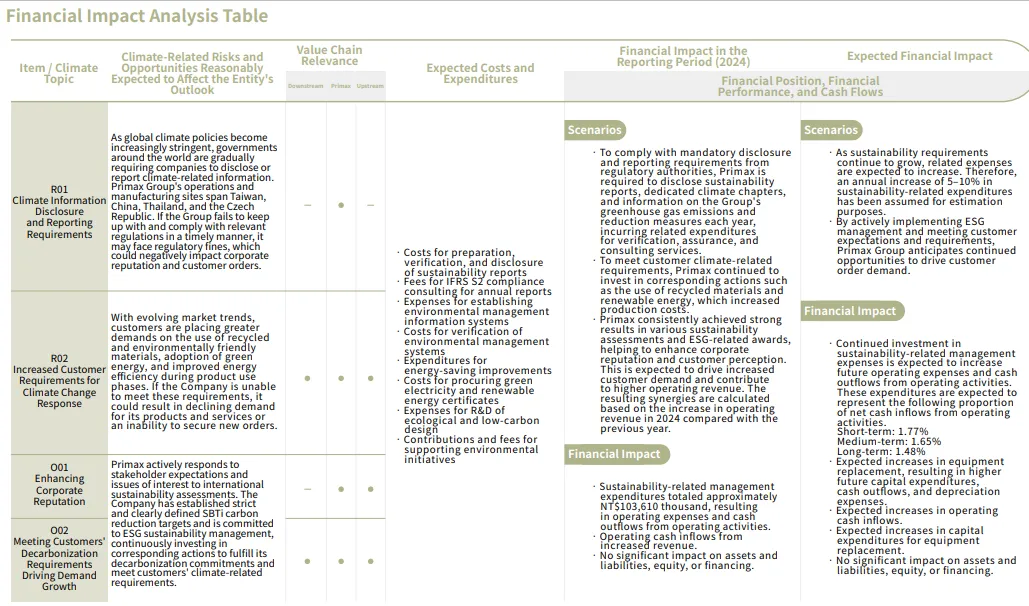 Based on the identified risks /opportunities, Primax etimates the potential financial changes that climate change may bring to Primax. It formulates risk response strategies and conducts cost and benefit assessments for "Cost Management" and "Benefit Management." The financial impact of climate risks/opportunities is assessed and estimated for the short-term (2024 ~ 2025), mid-term (2026 ~ 2028), and long-term (2029 ~ 2033) timeframes.