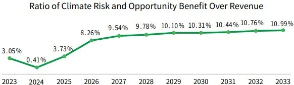 For the identified risk/opportunity items, their corresponding strategies, actions, and expected output benefits are quantified as financial information. The analysis of their impact on revenue composition is presented in the following chart. For the short term (2024 ~ 2025), the average financial impact is estimated to be approximately 2.07% of the operating revenue. For the medium term (2026 ~ 2028), the average financial impact is estimated to be approximately 9.19% of the revenue. For the long term (2029 ~ 2033), the average financial impact is estimated to be approximately 10.52% of the revenue.