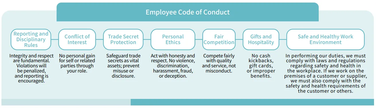 Furthermore, the Company's "Work Rules" and "Employee Code of Conduct" require all employees to comply with laws and ethical guidelines when performing business activities, whereas suppliers and business partners are bound to sign the "Statement of Suppliers" and “Supplier Code of Conduct” in order to create a trading environment following the principles of fairness, honesty, trustworthiness and transparency.