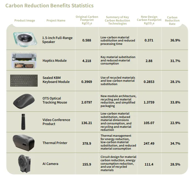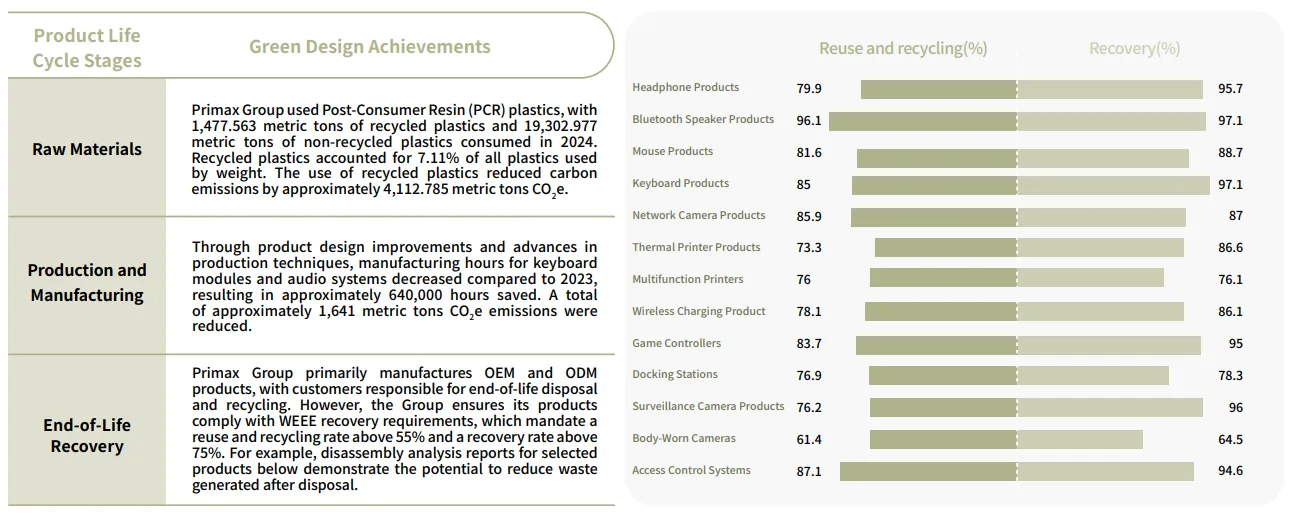 Between 2023 and 2024, the Group gradually established foundational capabilities in eco-design and low-carbon design and developed a product carbon footprint information system to compile baseline data for product carbon footprints. In 2024, Primax officially launched low-carbon design projects for major products and set a design target to reduce the carbon footprint of these products by more than 20%. This target has also been incorporated into the performance management and incentive mechanisms for R&D leadership.
