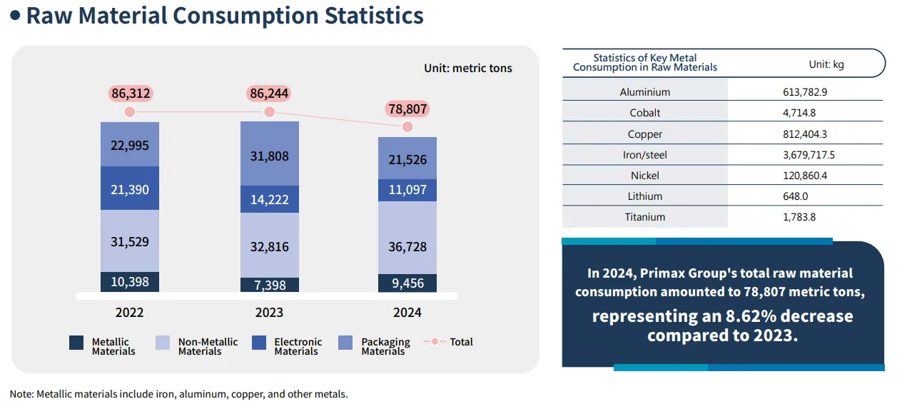 In 2024, Primax Group's total raw material consumption amounted to 78,807 metric tons, representing an 8.62% decrease compared to 2023.