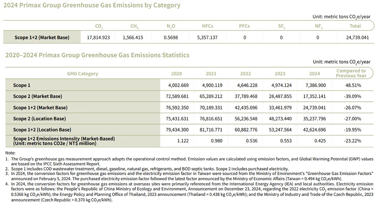 In 2024, Primax Group's Scope 1 and 2 greenhouse gas emissions totaled 24,739.0 metric tons CO2e per year (market-based), representing a reduction of 8,722.9 metric tons CO2e per year, or approximately 26.07%, compared to the 2023 baseline year. Since 2023, Primax Group has already achieved its original 2030 target of reducing greenhouse gas emissions by 60% (market-based) ahead of schedule. In 2024–2025, through the establishment and submission of SBT net-zero targets, the Group reset its greenhouse gas reduction targets, continuing to set higher standards and expectations for its progress toward net-zero emissions. Scope 1 and Scope 2 emissions were verified by SGS, in accordance with ISO 14064-3:2019 issued by the International Organization for Standardization (ISO). The verification opinion was a reasonable assurance level with an unqualified conclusion.