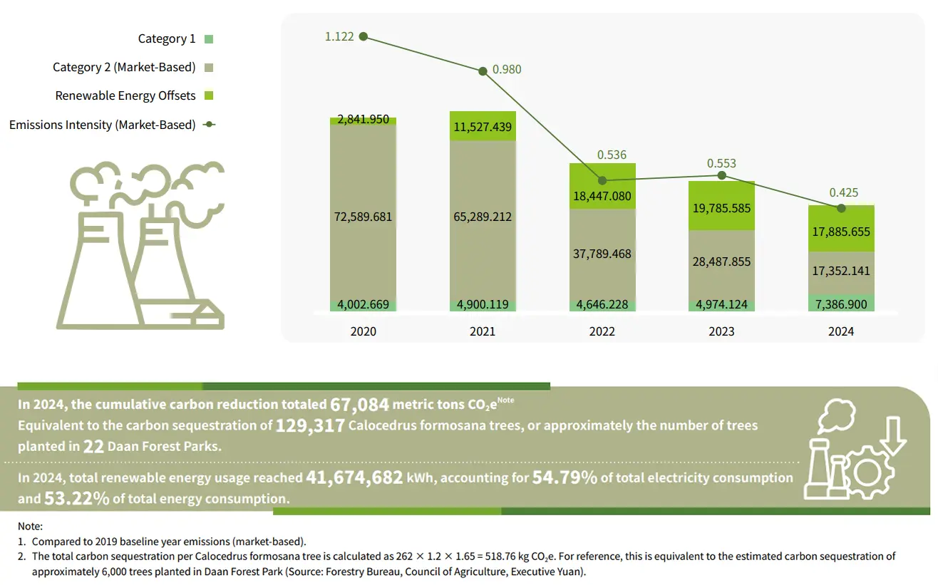 In 2023, the renewable energy certificate offset against 36,310,000 kWh and 19,785.585 tonne CO2e, accounting for 40.30% of the electricity consumption. From 2019 to the end of 2023, the cumulative purchase of Renewable Energy Certificates offset against a total of 57,192.133 tonne CO2e.