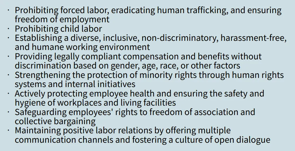 Regarding employee management, Primax Group strictly complies with the labor laws and regulations of the jurisdictions in which we operate. This compliance also extends to dispatched workers (labor service contractors) and their affiliated companies. Throughout the cooperation process, the Company diligently fulfills its responsibilities of investigation, assessment, and auditing. If any violations are identified, they may affect the continuation of the business relationship. In 2024, no such violations were found. At the same time, our Human Resources Department bears significant responsibility for managing the workplace and implementing talent development initiatives. These efforts include supporting diverse talent needs, facilitating cross-functional talent mobility, fostering employee communication and engagement, promoting learning and development, and designing compensation and benefits programs to motivate employees. HR also regularly monitors and analyzes human resource information to help managers improve performance and productivity. With a forward-looking perspective, HR provides senior management with insights into human capital performance issues.