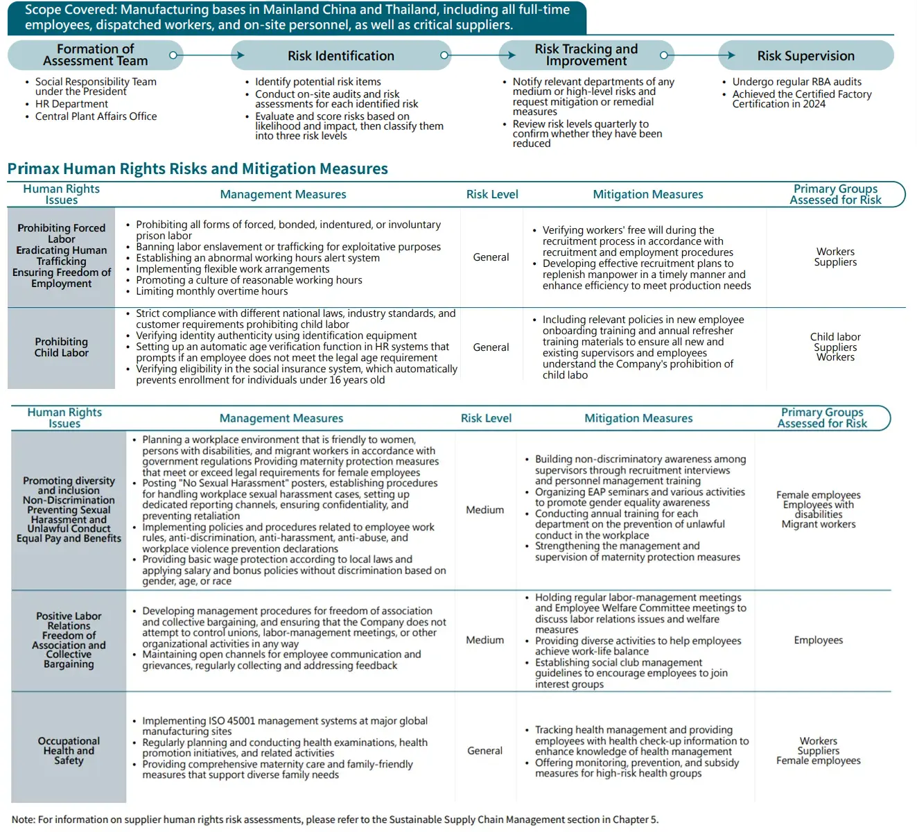Primax Group not only treats every employee equally but has also established its Human Rights Policy by referencing international standards, including the Responsible Business Alliance (RBA) Code of Conduct, the Universal Declaration of Human Rights, and the conventions of the International Labour Organization. Regular human rights risk assessments are conducted for all employees, including temporary staff, contract employees, and dispatched workers, as well as for existing suppliers. Identified risks are tracked and verified with appropriate mitigation measures. In addition, for new suppliers and new business activities such as mergers, acquisitions, and joint ventures, human rights risks are incorporated into the evaluation criteria. Primax is committed to creating a fair, safe, and comfortable working environment and to eliminating any issues that violate human rights. In 2024, no significant risks related to discrimination, child labor, or forced labor were identified. Should any incidents occur, corresponding human rights risk mitigation measures will be promptly activated.