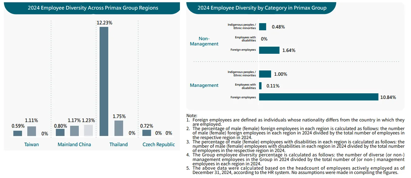 The Group is also committed to fostering a diverse workplace. In addition to hiring local employees, we recruit foreign workers to provide opportunities for international exchange and to broaden perspectives by exposing the Company and employees to different cultures and ways of thinking. At the same time, we place great importance on social care by maintaining a guaranteed number of positions for persons with disabilities each year. This approach allows individuals with disabilities not only to demonstrate their abilities but also to meet their living needs. Primax (Taipei) has achieved the legally required employment quota for employees with disabilities, demonstrating our dedication to promoting an equal and inclusive workplace.