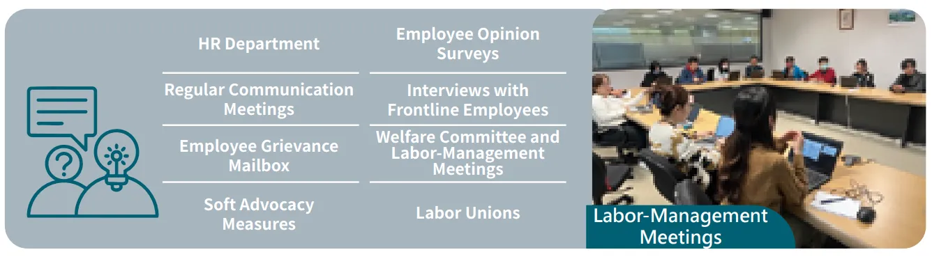 All grievance channels and union committee members have effectively fulfilled their functions, helping employees communicate their concerns and resolving them through meetings. In 2024, employees utilized labor-management meetings, unions, Employee Welfare Committee meetings, and opinion boxes to submit a total of 664 cases. All 664 were addressed and responded to, achieving a 100% resolution rate.