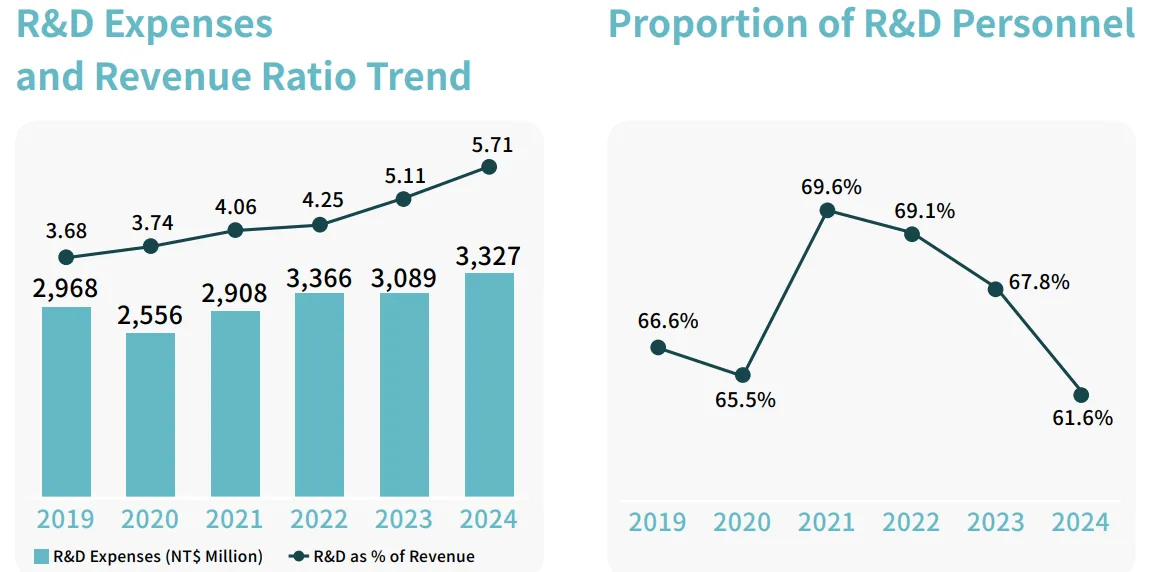 The primary driver of Primax Group's sustained profitability and growth is its commitment to embracing innovation. Primax's technology development is centered on integrating three core elements—acoustics, visual technologies, and human-machine interfaces—into cohesive product applications. In an era of rapid technological evolution, the Company continues to develop key new technologies and products that contribute to sustained profitability while extending its business presence into every aspect of daily life. To further strengthen the Group's R&D and technological competitiveness, in 2024 the Company invested NT$3,327,670 thousand in research and development expenditures, representing 5.71% of operating revenue. These resources were dedicated to the design and development of new products and technologies, as well as the enhancement and improvement of production processes. Details of recent R&D achievements are presented on 《pages 69–70 of the 2024 Shareholders' Meeting Annual Report.》