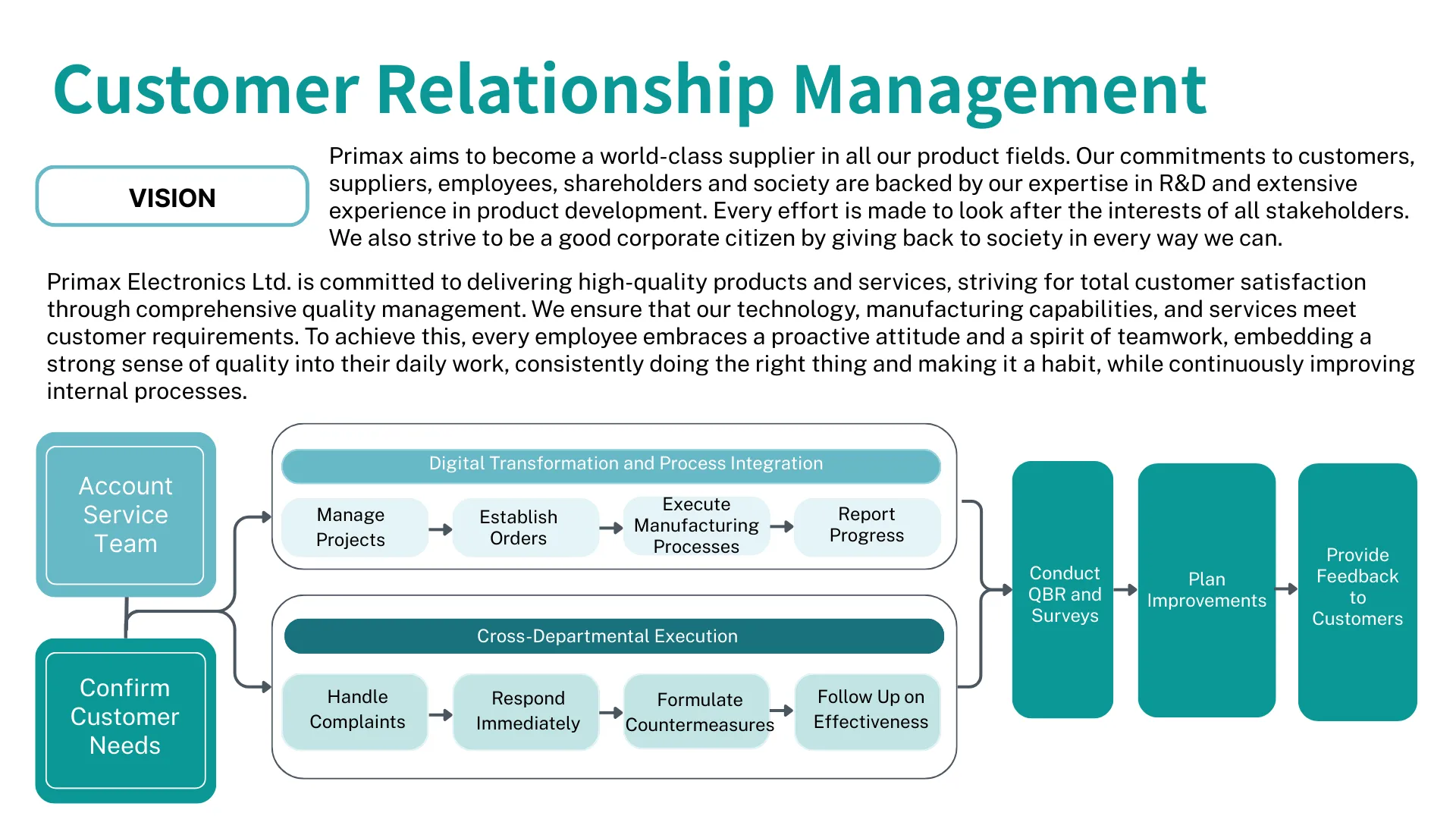 Primax remains committed to its mission of "Taiwan R&D, Smart Manufacturing, GlobalReach," serving customers worldwide. The Taiwan Innovation Hub in Zhubei is scheduled for completion in mid-2025 and will encompass advanced laboratories, an industry–academia incubation center, and a new product manufacturing center. In terms of global manufacturing operations, production and shipments from the Company's plants in Thailand and the Czech Republic have continued to grow steadily.