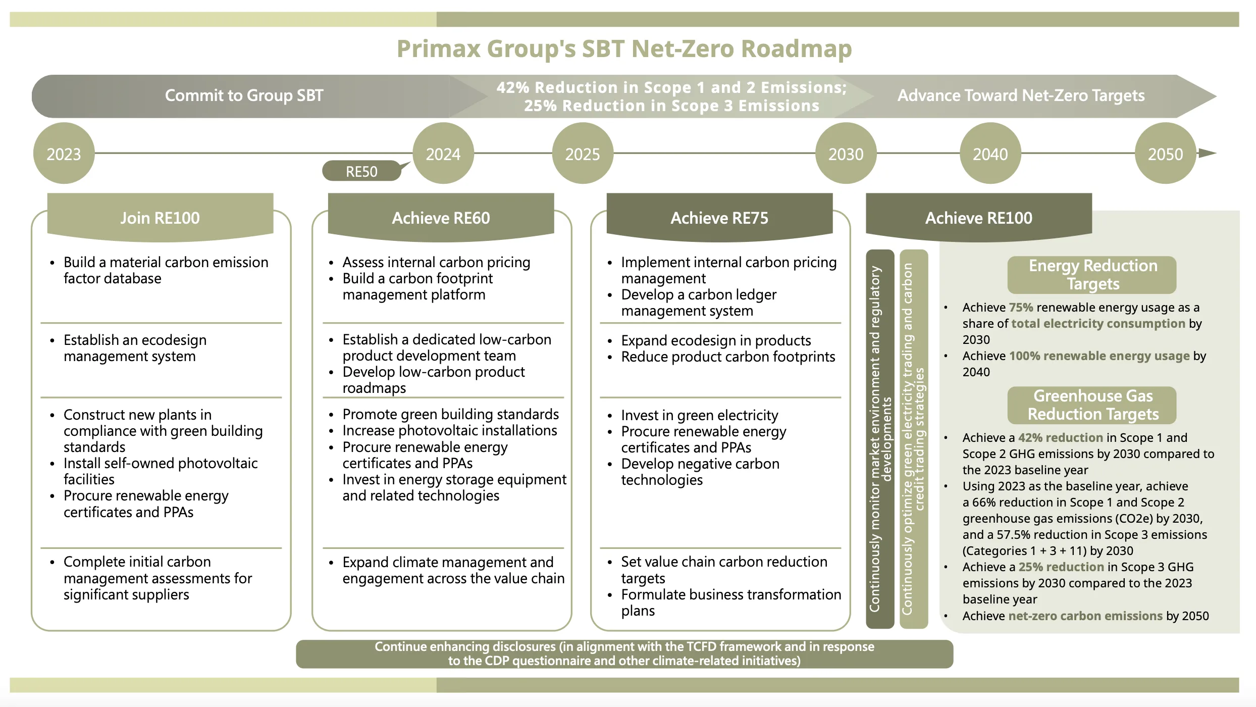 In 2023, the Company adopted the approach defined by the Science Based Targets initiative (SBTi) to establish emissions reduction targets for its major production sites, Primax (Kunshan) and Primax (Chongqing), in line with the 1.5° C pathway. In the same year, these targets were officially approved by the SBTi. Based on the 2024 greenhouse gas inventory results, both sites achieved and exceeded their annual emissions reduction targets. Primax Group submitted its SBT 1.5° C net-zero commitment in January 2024 and submitted its target at the end of 2024. In April 2025, the SBTi approved the Group's 1.5° C net-zero target. Primax will continue to advance mitigation and innovation activities to reduce greenhouse gas emissions and work toward achieving net-zero emissions by 2050.