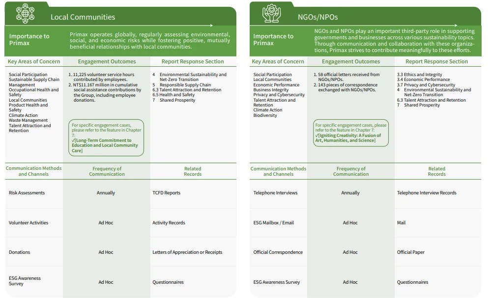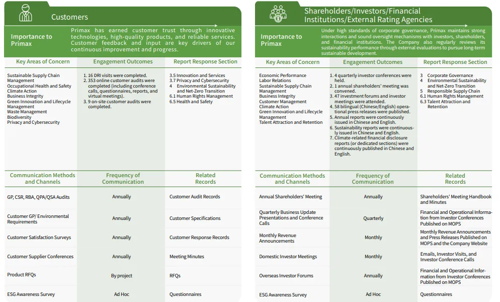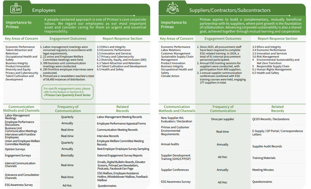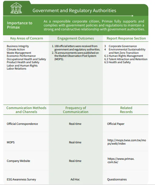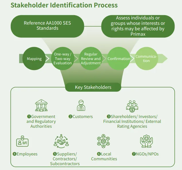 Primax places great importance on the interests and opinions of stakeholders and engages in continuous communication and engagement. The engagement approach adopts diverse forms, including unilateral, bilateral, one-to-many, or many-to-one, with the aim of understanding stakeholders' concerns and expectations towards Primax. The ESG Office conducts biannual communication with key representatives of various stakeholder groups, gathering their perspectives on sustainability issues and identifying any significant impact events. The consolidated report from these engagements serves as a reference for identifying material issues and is regularly presented to the Board of Directors.