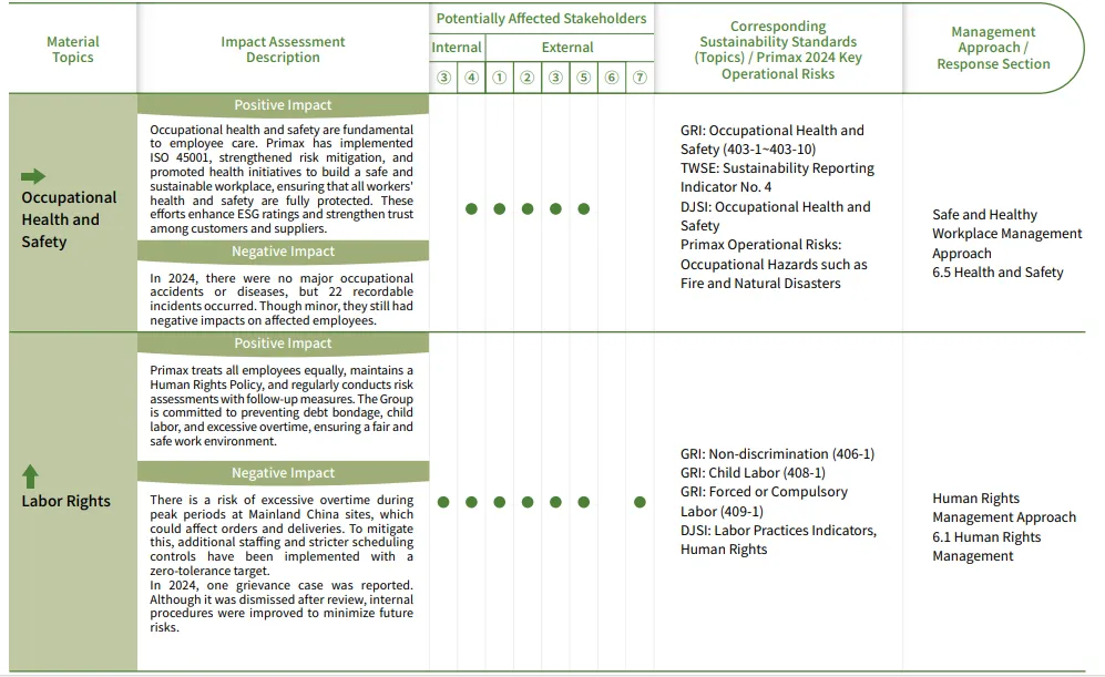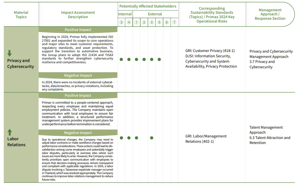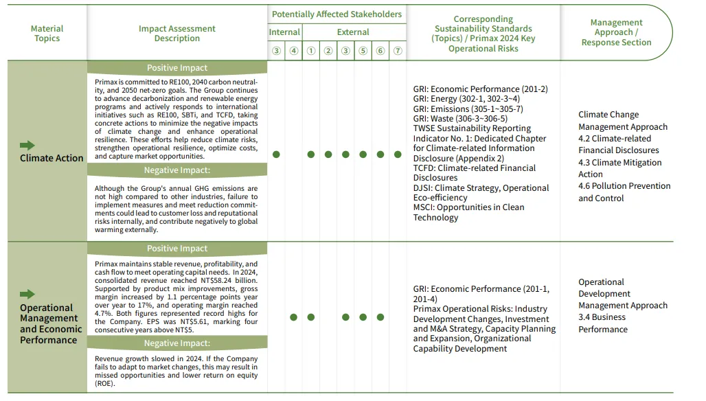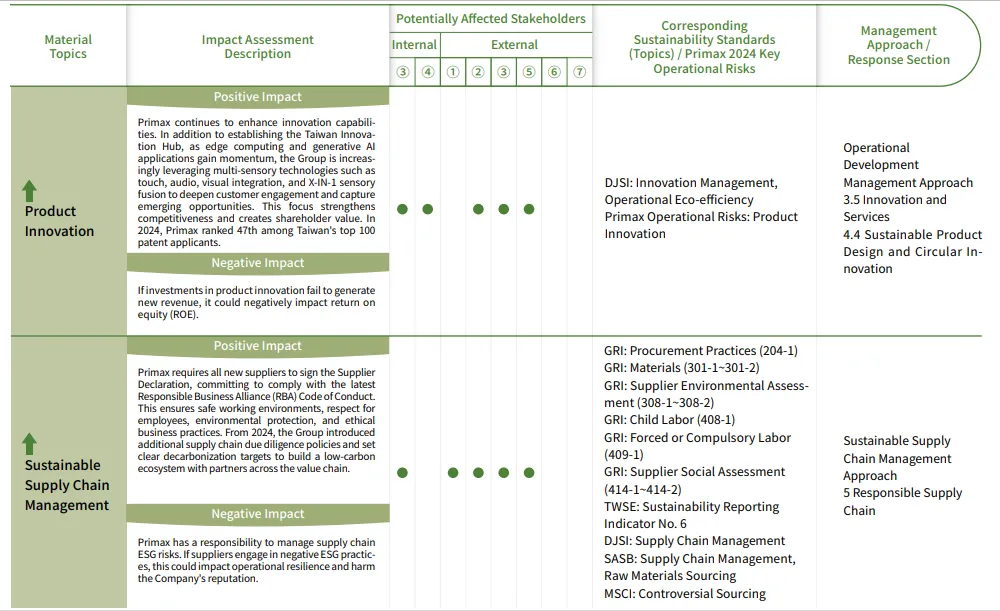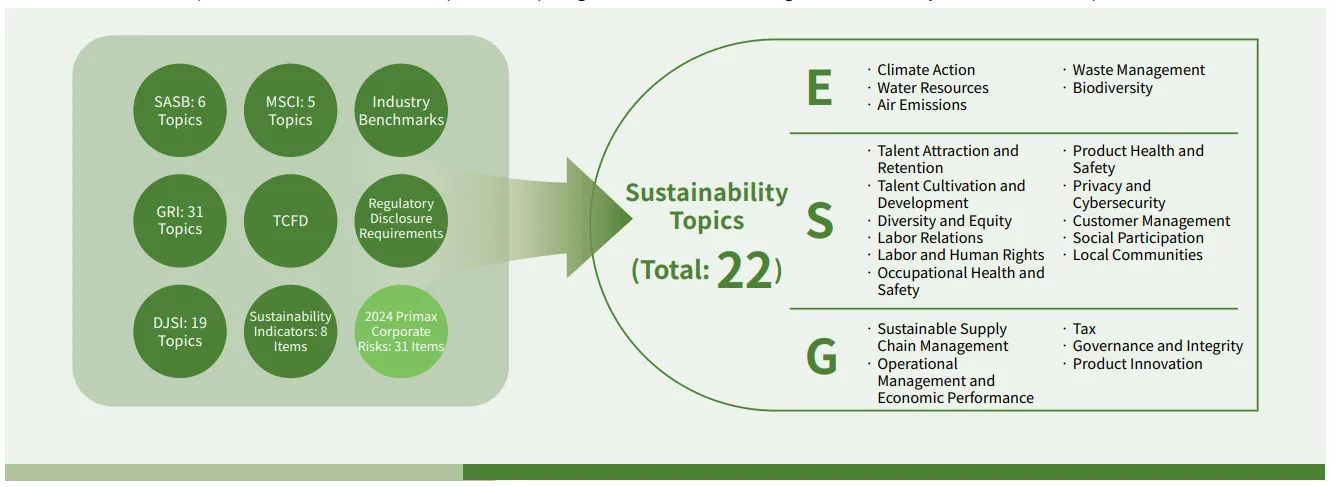 Prior to the ESG issues assessment, we first compiled the ESG issues that might pose some impact on the external economy, environment, human rights or company operations, in reference to sustainability standards and regulations (GRI, SASB, TCFD), ESG rating institutions (DJSI and MSCI, etc.), Rules Governing the Preparation and Filing of Sustainability Reports by TWSE Listed Companies, Issues of Concern to Stakeholders, Material Topics in the Upstream and Downstream Segments of the Value Chain (peers and major customers), Industry Characteristics and Relevant Regulations, and ESG advice and suggestions. In addition, during the year, Primax continued to integrate the 2024 corporate risk items, which include sustainability risks, climate-related risks, and other emerging risks, into the list of sustainability topics as sources for impact assessment. This approach ensures the completeness and relevance of the topics and helps align assessment results with global sustainability trends and investor priorities.