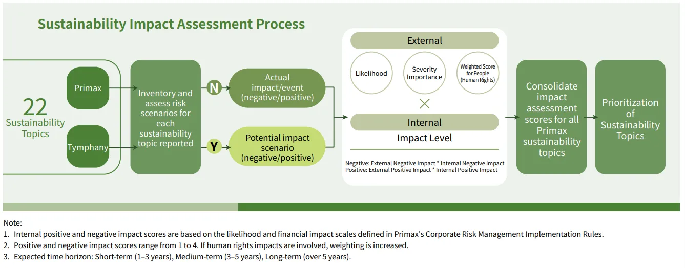 The ESG Office of Primax and the top executives of each unit at Tymphany conducted a positive and negative impact scenario analysis of each ESG issue based on Primax Group's actual management status, and then assessed the impact posed by each ESG issue externally (economy, environment and population (including human rights thereof) and internally (Primax’s operations)based on the impact scenarios. When assessing the significance of impacts, the likelihood and severity (scale, scope, and remediation difficulty)/importance(scale, scope and likelihood) of each ESG issue shall be taken into consideration.Meanwhile, the level of concern questionnaire was also conducted with respectto the seven major stakeholders, and a total of 64 valid questionnaires were collected as a reference for determination of material ESG issues.