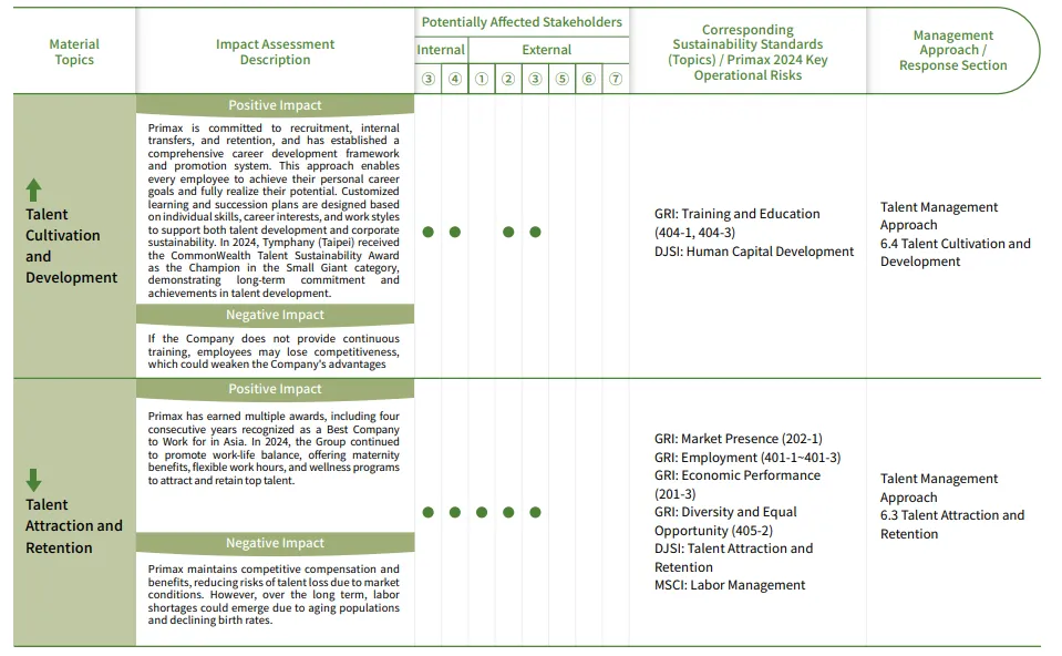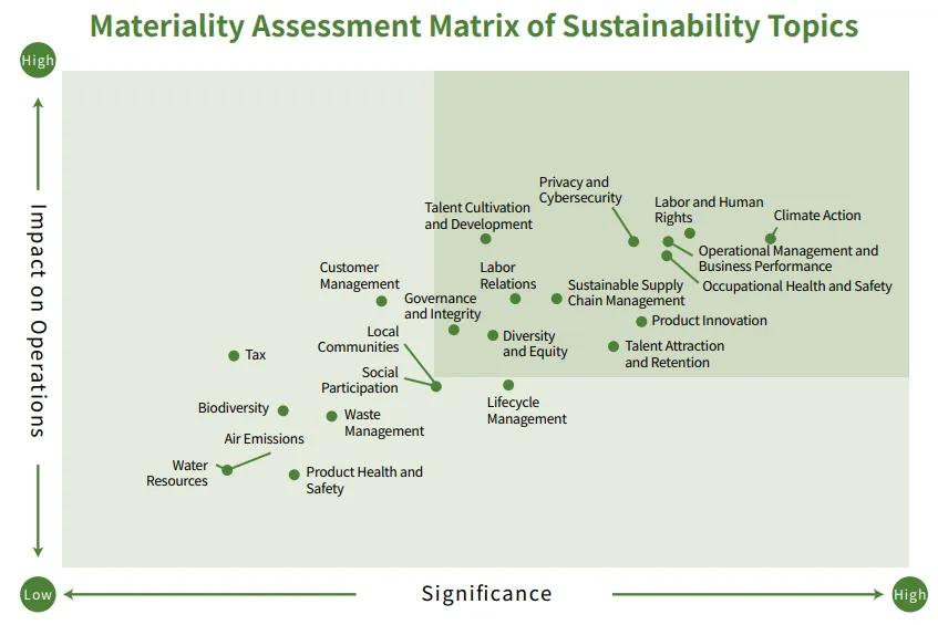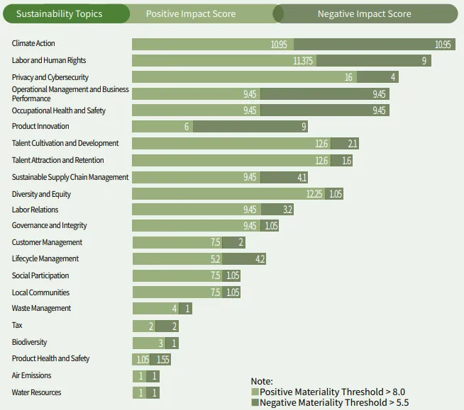 Based on the prioritization results, the ESG Office, together with external sustainability consultants and consideration of stakeholder priority scores, identified topics exceeding the negative threshold (5.5) and positive threshold (8.0) as material topics for the year. These include Climate Action, Labor Rights, Privacy and Cybersecurity, Operational Management and Economic Performance, Occupational Health and Safety, Product Innovation, Talent Cultivation and Development, Talent Attraction and Retention, Sustainable Supply Chain Management, Diversity and Inclusion, Labor Relations, and Governance and Integrity, totaling 12 topics, with no significant changes compared to the previous year.