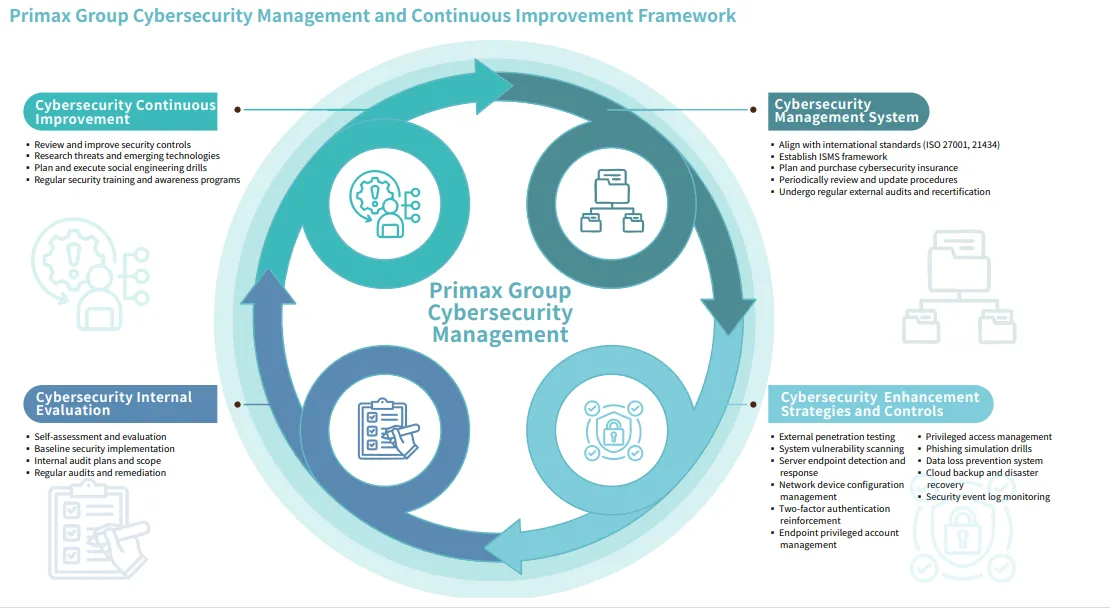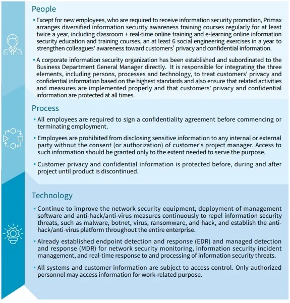 Meanwhile, Primax Group is committed to protecting customer information security to safeguard customers' interests and rights. The Company has established management policies and procedures for customers' privacy and confidential information, adhering to the principle of "least privilege." Access to sensitive data related to customer projects is granted only after internal authorization, and the Group's Cybersecurity Department conducts regular reviews on cybersecurity-related procedural documents to ensure timely updates that meet the required level of information security management in line with customer needs and demands.