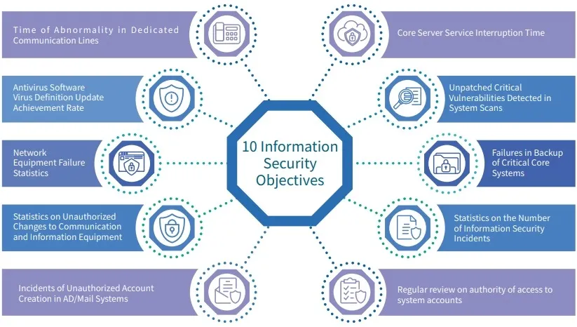 - To meet the requirements of internal information security regulations and external regulatory authorities, the Group has established an Information Security Management System and information security management procedures. Ten information security objectives have been formulated, and the results of their achievement are recorded on a monthly basis.