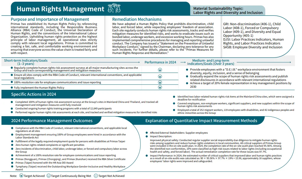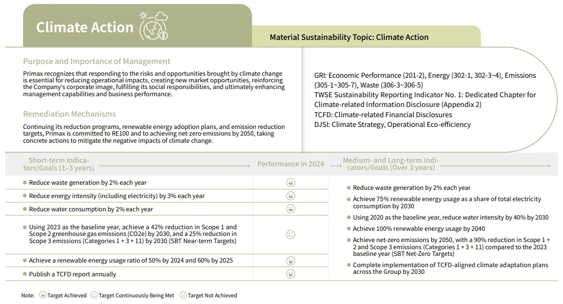 Based on the identified material sustainability issues, we have listed our short-, medium-, and long-term goals for these issues, the achievement rates for 2023, and the corresponding action plans. Additionally, we provide an explanation of other performance results beyond the quantitative targets. The achievement status is represented by icons in the achievement rate column: 😃 Goal Achieved, 🙂 Goal Achieved Continuously, 😐 Goal Not Achieved. Furthermore, for these material sustainability issues, we have also assessed the impact on external stakeholders and disclosed the relevant performance outcomes.