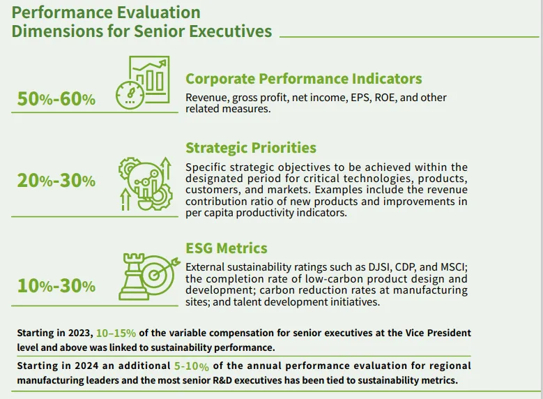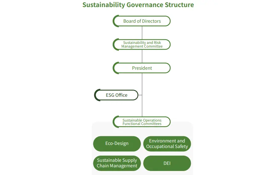 Under the authority and vision of the board of directors, the ESG Office is required to assist fellow departments and units in the implementation of ESG projects in a manner that conforms with the Company's economic, environmental and social efforts. The ESG Office is also responsible for gathering informationsuch as stakeholders' feedbacks on issues of concern, local and global sustainability trends, and best practices of industry leaders, as well as offering suggestions and guidance to departments for the sustainability of the Company.In 2022 , the Board of Directors approved Primax Group's Sustainability Strategy Roadmap and authorized under the Roadmap the Chairman to agree to a total of 29 goals to be implemented by various business and staff units. Meanwhile, since 2023 , it has formulated the variable remuneration forsenior management teams including the vice president and above by 10 ~ 15 % linked to ESG performance. The performance assessment standards includethe Company’s performance indicators, annual strategic priorities and ESG indicators, aiming to stimulate and improve business efficiency and sustainable competitiveness to help achievement of long-term value creation and ESG goals.【For more detailed information on the sustainability strategy blueprint, please refer to《 "Primax SDGs Sustainable Strategy Blueprint.” 》】