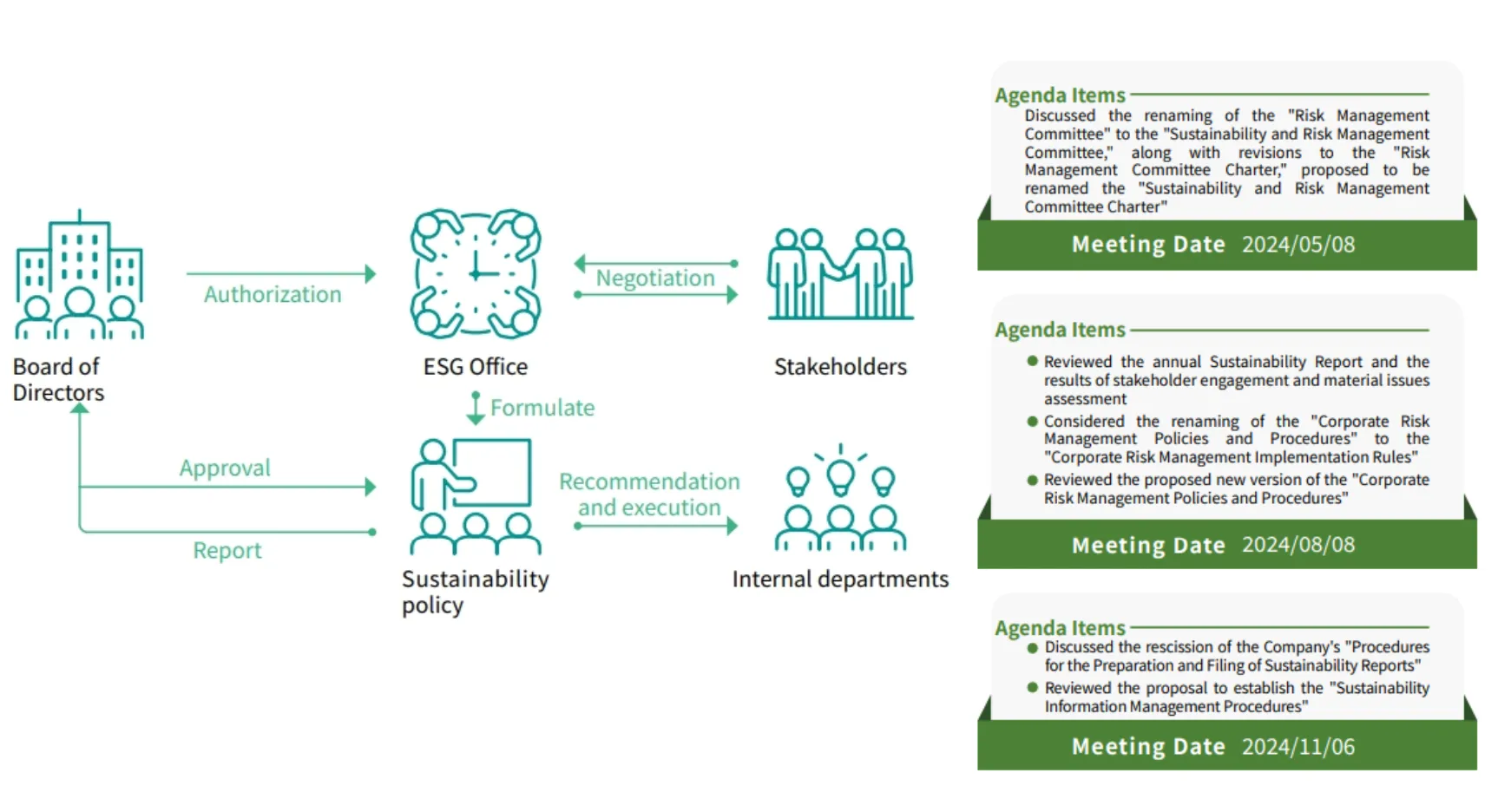 The ESG Office reports to the Board of Directors semi-annually, providing updateson stakeholder communication, significant events and disclosure material issues, greenhouse gas inventory conclusions, annual execution plans, and more, prior to the publication of the sustainability report. The specific implementation plans are then approved by the Board. At the end of the year, the ESG Office reports on the achievements of the planned executions,risk assessment results, and corresponding measures. This demonstrates Primax’s strong commitment to implementing sustainable development. In 2024, the Board of Directors convened a atotal of 9 meetings. The sustainability-related agenda items are summarized in the table below.