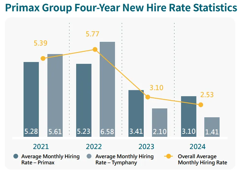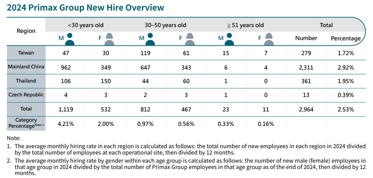 In 2024, Primax Group hired a total of 2,964 new employees (1,954 male and 1,010 female), with an average monthly hiring rate of 2.53%. Among them, Primax hired 2,406 new employees (1,600 male and 806 female), with an average monthly hiring rate of 3.10%. Tymphany hired 558 new employees (354 male and 204 female), with an average monthly hiring rate of 1.41%.