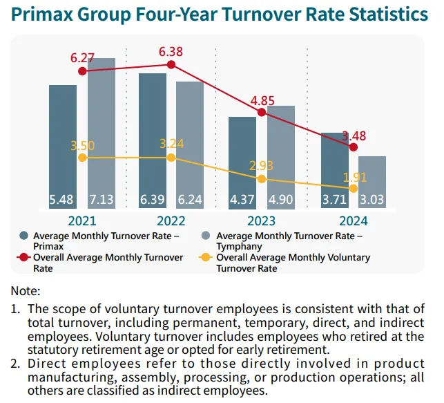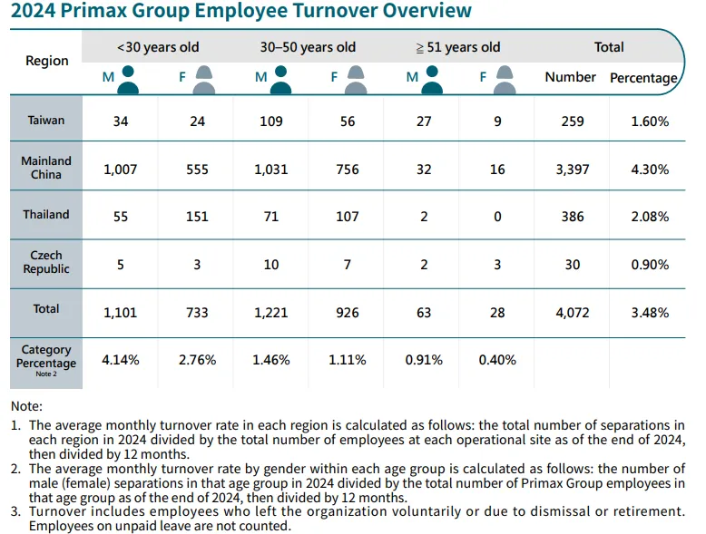 In 2024, PrimaxGroup recorded a total of 4,072 employee separations (2,385 male and 1,687 female), with an average monthly turnover rate of 3.48%. Among them, Primax had 2,875 separations (1,704 male and 1,171 female), with an average monthly turnover rate of 3.71%. Tymphany had 1,197 separations (681 male and 516 female), with an average monthly turnover rate of 3.03%.