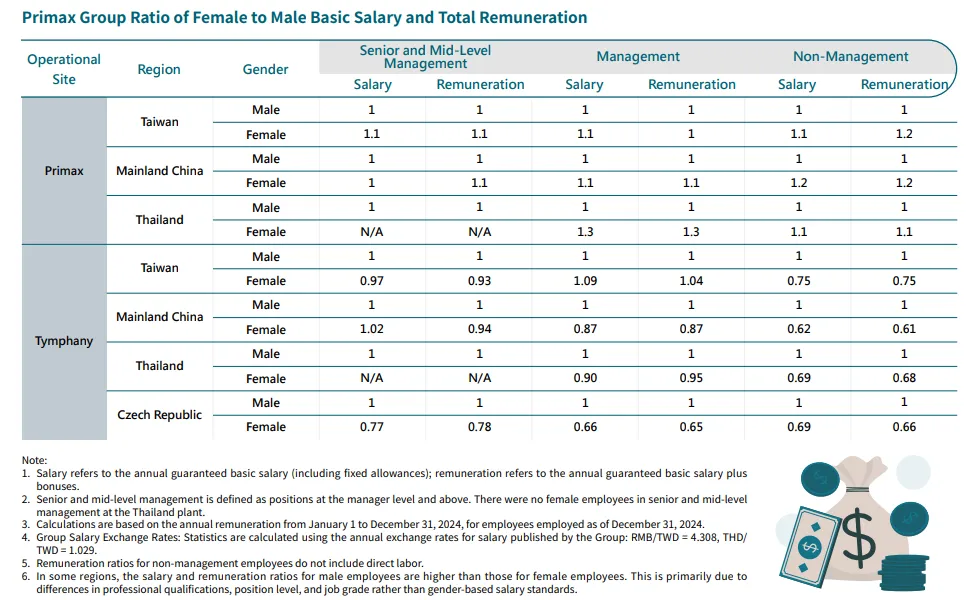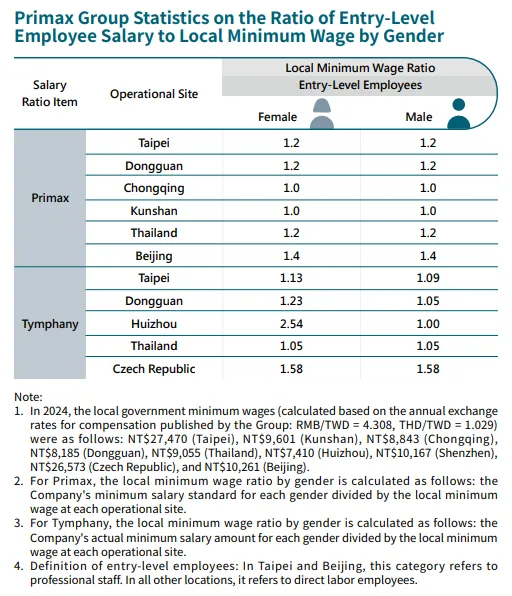 At Primax Group, the ratio of entry-level employee salaries to the local minimum wage shows no gender disparity. All employees earning the minimum wage are paid above statutory minimum standards, and there are no cases where salaries fall below the legal minimum. Workers engaged by the Group are compensated on the same basis as local entry-level employees, in accordance with local policies.