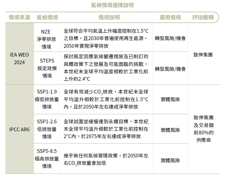 致伸密切注意全球氣候變遷趨勢與國際應變方向,將氣候變遷納入企業永致伸密切注意全球氣候變遷趨勢與國際應變方向,將氣候變遷納入企業永續發展的重大議題與關鍵性重大風險項目之一,持續進行分析與管控,並致力於溫室氣體的調適與減緩工作。2024年致伸進一步依循國際永續準則委員(International Sustainability Standards Board, ISSB)發布之國際財務報導準則第S2號氣候相關揭露(International Financial Reporting Standards S2, IFRS S2),並參考台灣金融監督管理委員會與財團法人中華民國會計研究發展基金會共同製作之IFRS S2氣候相關揭露之揭露範例,編製本年度氣候相關財務揭露報告書。完整揭露內容請參閱致伸集團發布之第四本《氣候相關財務揭露報告》,或參閱本報告書《2.1 永續管理與實踐》及《3.6風險管理章節》。部份內容摘要如下:
