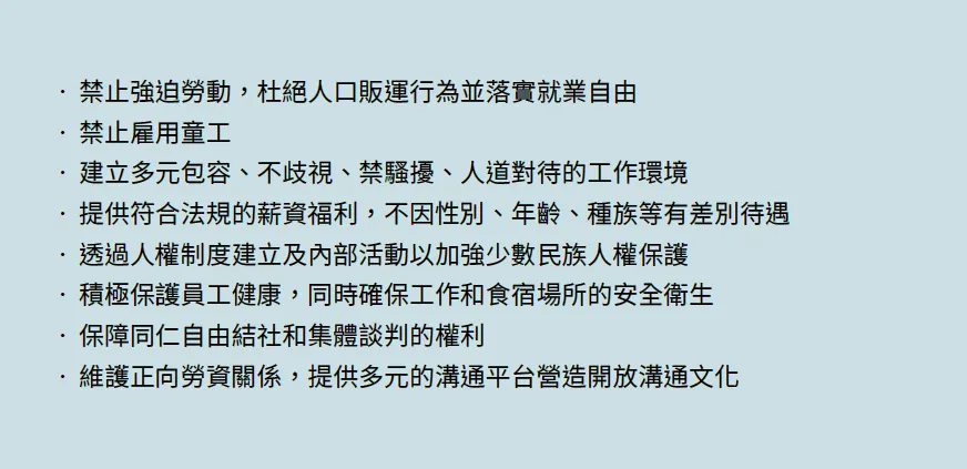 致伸集團除了平等對待每一位致伸同仁外,我們參考RBA責任商業聯盟行為準則、聯合國世界人權宣言、國際勞工組織公約等國際規範,訂定不歧視、禁用童工、杜絕強迫勞動、尊重員工結社自由的人權政策,針對全體員工(包括臨時、契約員工和派遣工作者),以及現有供應商定期進行人權風險評估,並針對風險項目追蹤及確認因應措施,以打造公平、安全、舒適之職場環境視為己任,徹底根絕相關違反人權的議題。2024年無重大歧視、童工、強迫勞動、自由結社和集體談判等人權風 險,若有實際事件發生,將啟動對應之人權相關風險減緩措施。