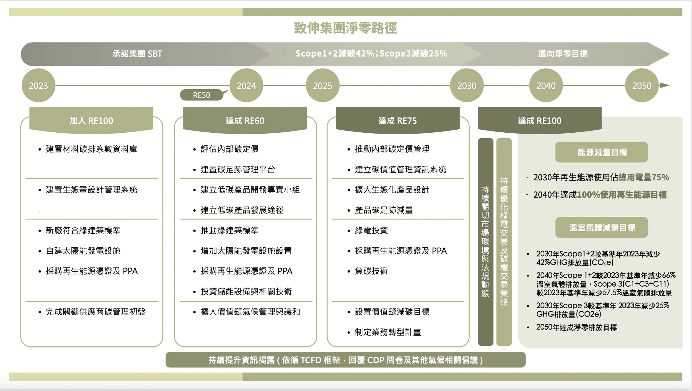 致伸於2022年4月29日正式宣布加入RE100倡議組織,承諾2040年全球營運據點100%使用再生能源,並達到碳中和的目標,響應《巴黎氣候協定》與全球共同朝向地球升溫不超過1.5度C努力。我們多年來關注環境相關議題,並且落實於各項促進環境永續的計畫和措施中,集團七大據點均依循ISO14001環境管理系統、ISO5001能源管理系統、ISO14046水足跡及ISO14064-1溫室氣體盤查等標準及管理流程,均取得第三方查(驗)證聲明書。面對氣候變遷帶來的重大威脅,致伸更加積極規劃與執行減碳的因應措施,承諾加入RE100及宣示碳中和是一個重要的里程碑,未來將會發展生態設計及綠色製程,進一步影響供應鏈一同關注氣候變遷議題並付諸行動。