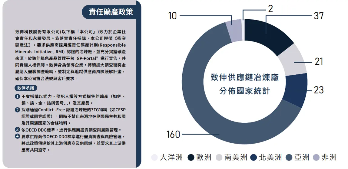 在調查過程中,致伸參考RMI (Responsible Minerals Initiative) 所制定的3TG合格冶煉廠清單,要求供應商必須使用經過RMI認證的冶煉廠。同時,我們也定期比對最新的冶煉廠清單,確保使用中的材料能符合最新的清單要求。在2024年,我們所使用的冶煉廠中,有31家冶煉廠因沒有通過RMI 的稽核,而被移出合格清單。們也立即啟動供應鏈調查,要求供應商調查其上游材料製造商的冶煉廠使用狀態,以確保不會誤用到已不在合格清單的冶煉廠。 同時,致伸也遵循 < 經濟合作與發展組織受衝突影響和高風險區域礦石負責任的供應鏈盡職調查指南> ,識別企業內供應鏈中的風險及根據指南附錄二的供應鏈政策標準和盡職調查建議對進行風險評估。在2024年,我們所使用的冶煉廠中,有31家冶煉廠因沒有通過RMI 的稽核,而被移出合格清單。