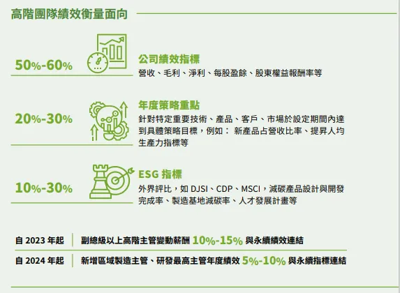 此外,在董事會授權的願景及方向下,企業永續辦公室必須協助各事業及幕僚單位推動和執行企業永續專案,以回應公司於經濟、環境及社會的各項議題。同時也定期蒐集利害關係人所關注的重大議題和回饋、國內外永續發展相關趨勢、以及標竿企業的最佳實務作法,提供建議及指導相關部門落實,以持續強化公司永續經營。董事會於2022年核准致伸集團永續策略藍圖,並在此藍圖下授權董事長同意各事業及幕僚單位共29項執行目標,並自2023年開始,擬定副總級以上高階團隊之變動薪酬 10 ~15%與永續績效連結,績效衡量面向包含公司績效指標、年度策略重點及ESG指標等,激勵並提高業務運營效率和永續競爭力,有助於實現企業的長期價值創造及達成永續發展目標。【詳細永續策略藍圖說明請參考《致伸SDGs永續策略藍圖》】