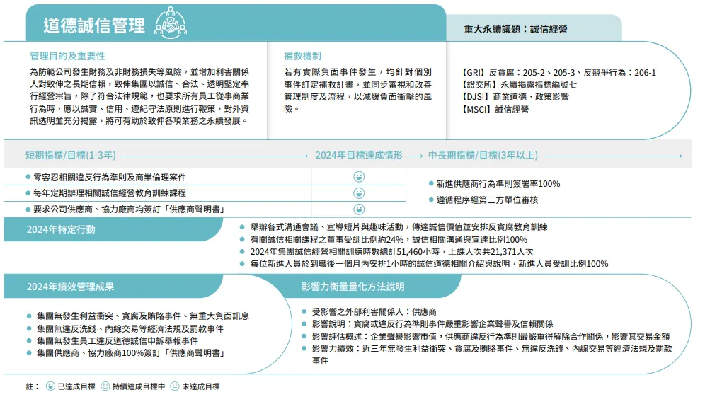 致伸根據所鑑別出來的永續重大議題,以下列出我們針對這些議題所設定的短、中長期目標、2024年度的目標達成率,以及對應目標所擬定的行動方案,和量化目標之外的其他績效成果說明,並於目標達成率欄位中,以圖示代表達成狀況:😃已達成目標 🙂持續達成目標中 😐未達成目標。除此之外,針對這些永續重大議題,我們同時衡量了對外部利害關係人的影響程度及揭露其相關行動績效。