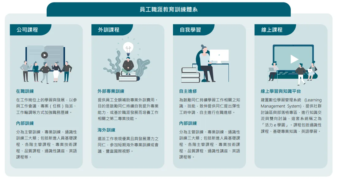 致伸除了薪資與退休後照護外,也認為心靈上的富足相當重要,因此我們希望能幫助員工們在職場不只是工作,而是能在工作中獲得成長。我們規劃了完整的教育訓練架構,並提供各種不同面向的課程與講座,幫助員工在工作之餘也能有所收穫,精進與工作相關之技能,或學習更多自己感興趣之事務。除此之外,我們也會針對因業務或工作調整離職之員工,詢問其是否有協助再就業之需求,若有需求則協助於Head Hunter或其他工作轉介網站進行刊登。